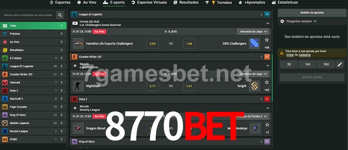 O 8770Bet oferece uma grande seleção de opções de apostas em e-sports com probabilidades competitivas